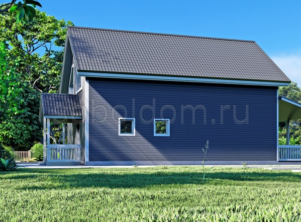 Углы, стойки, пояса выполнены из обрезной доски 150×40 (200×400) мм с шагом 600 мм. Раскосины из обрезной доски 100×40 мм. Каркас стен утепляется мин. ватой Кнауф Термо Плита в 150 (200) мм, с прокладкой ветроизоляции с внешней стороны и пароизоляции с внутренней стороны. Стены снаружи обшиваются имитацией бруса 17×140 мм (камерной сушки), через контр-рейку 50×20 (50×40) мм, крепится на оцинкованные гвозди. Внутри стены дома без отделки. |