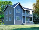 Углы, стойки, пояса выполнены из обрезной доски 150×40 (200×400) мм с шагом 600 мм. Раскосины из обрезной доски 100×40 мм. Каркас стен утепляется мин. ватой Кнауф Термо Плита в 150 (200) мм, с прокладкой ветроизоляции с внешней стороны и пароизоляции с внутренней стороны. Стены снаружи обшиваются имитацией бруса 17×140 мм (камерной сушки), через контр-рейку 50×20 (50×40) мм, крепится на оцинкованные гвозди. Внутри стены дома без отделки. |